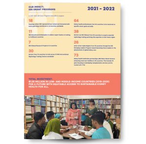 Our overarching purpose is to tackle the global burden of acute kidney injury (AKI), chronic kidney disease (CKD) and end-stage kidney disease (ESKD). We build capacity with healthcare professionals via granting programs, education and research. We bridge gaps in global kidney care, engaging in a collaborative effort with global partners to improve kidney disease prevention, diagnosis and treatment. By connecting communities, we develop a stronger understanding of how to manage kidney disease.