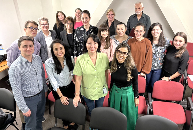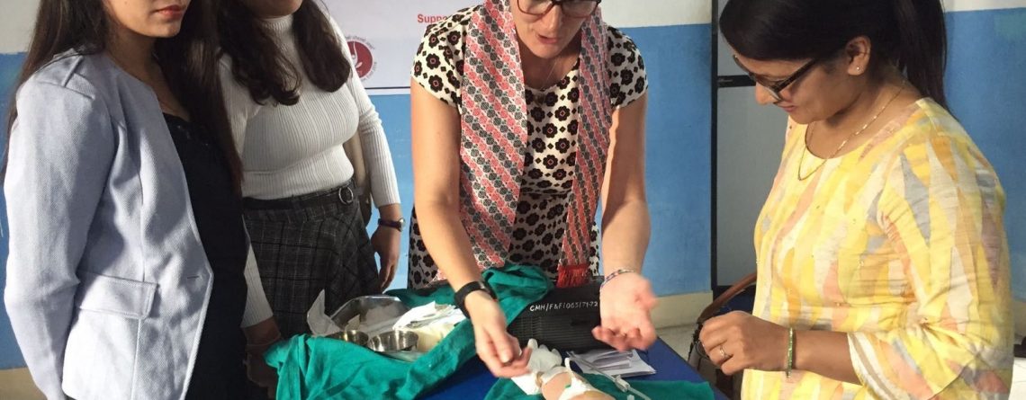 Rea Judit Jerabekne Vegh (center right) demonstrating hemodialysis techniques to nurses at the Charak Memorial Hospital (CMH) in Nepal.