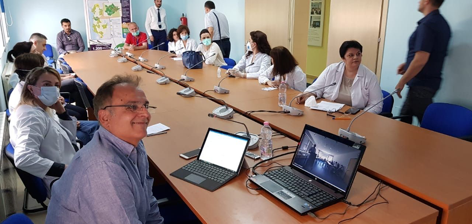 Health professionals at the University Hospital Center in Tirana, Albania, congregate for a webinar