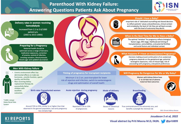A visual abstract on pregnancy and kidney failure based on the Kidney International Reports article “Parenthood with Kidney Failure: Answering Questions Patients Ask About Pregnancy” was released during an ISN Twitter space on September 14, “Pregnancy Matters.”
