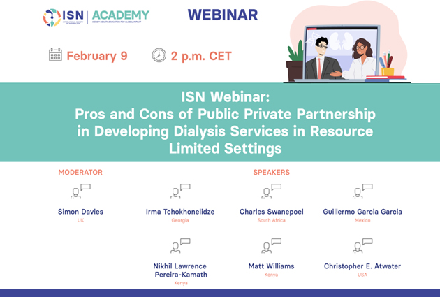 The webinar, “Pros and Cons of Public-Private Partnerships in Developing Dialysis Services in Resource-limited Settings,” will take place on February 9, 2023, from 2-3 p.m. CET.