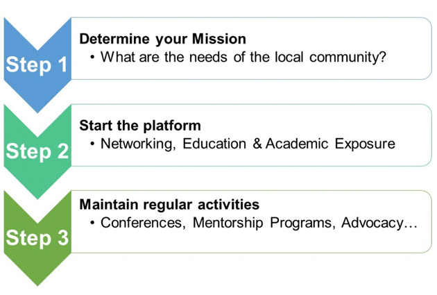 For the next stage, several enthusiastic and responsible people are required who can help you advance the emerging organization in three potential domains: networking, education, and academic exposure. At this point, a plethora of opportunities are open to your association – you can run regular educational meetings and sessions at conferences, develop mentorship programs, establish research networks, improve local practices, and, last but not least, find new friends and collaborators who can help you advance your career and achieve professional recognition.