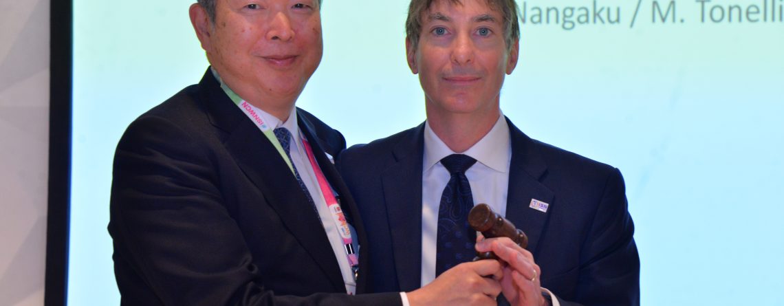 Immediate Past President Masaomi Nangaku passes the gavel to Marcello Tonelli at WCN’25