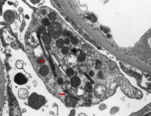 Kidney biopsy establishing the diagnosis of light chain crystalline podocytopathy, a rare form of MGRS
