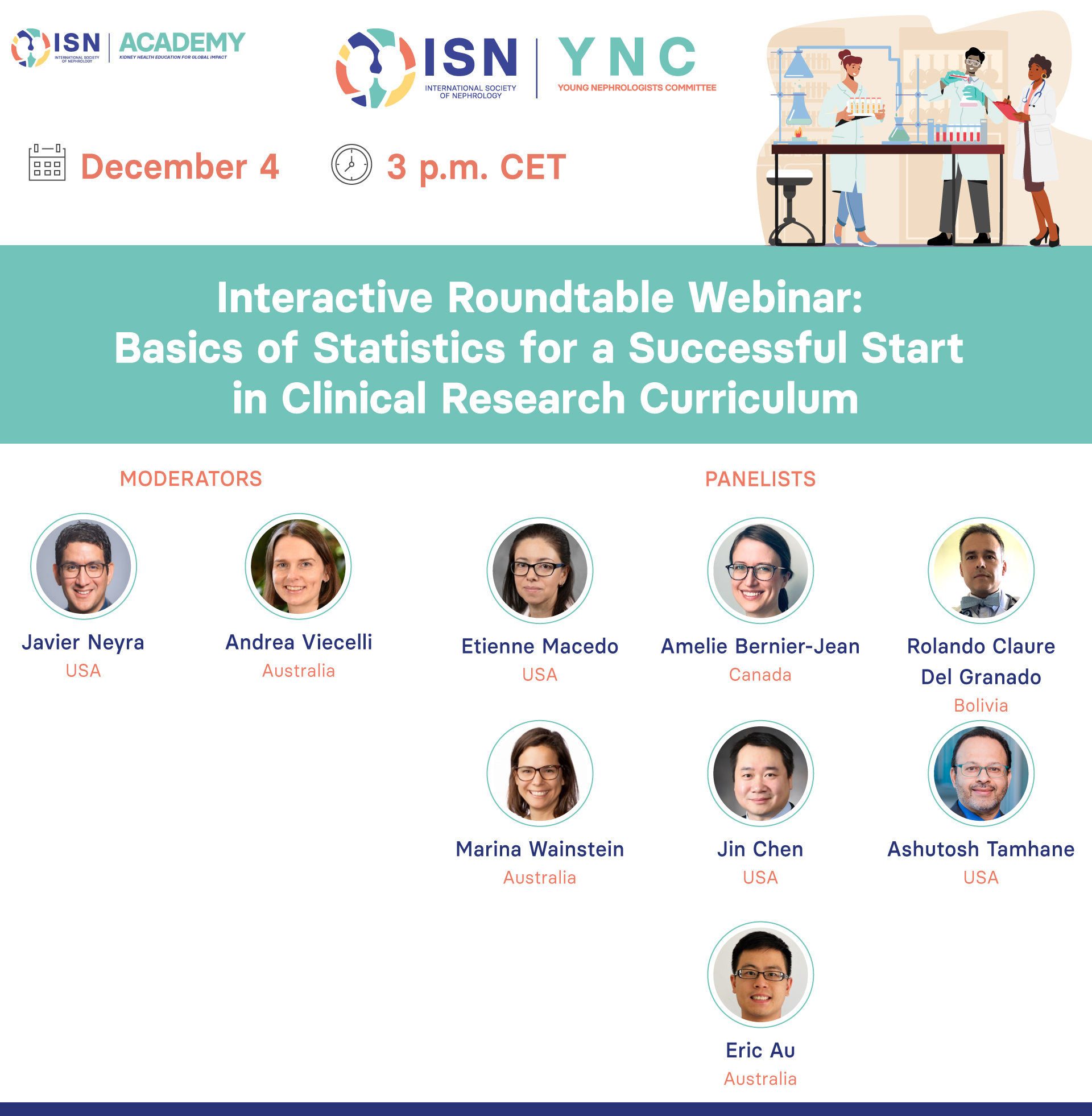 This interactive webinar will be a virtual live round table discussion with course directors and speakers to discuss salient questions regarding the statistics curriculum entitled “Basics of Statistics to Get Started in Clinical Research”. This online curriculum consisted of 6 topic presentations aimed to cover key aspects of statistics that could assist nephrologists and related healthcare professionals worldwide to better appraise literature, enhance clinical research proposals, analyze and interpret data from clinical trials and observational studies and to build collaborative research networks.