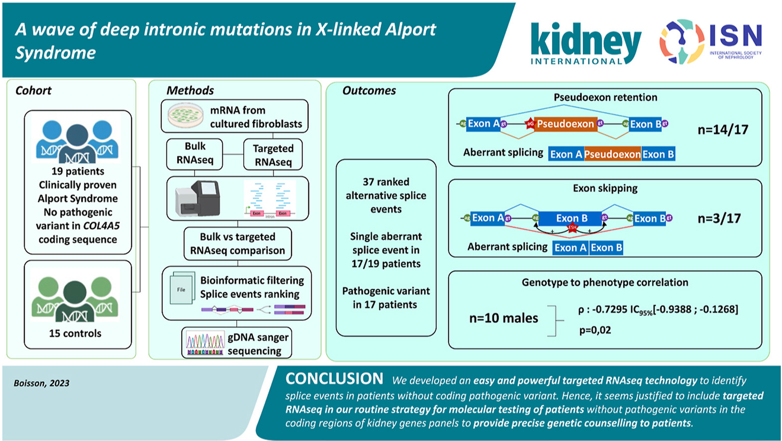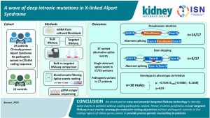 Alport syndrome is an X-linked disorder with a defect in the COL4A3-5 coding sequence. This causes glomerular basement membrane disruption. Identifying splice events in those who lack specific coding for the pathogenic variant of this disease process may be helpful. With proper detection of such monogenic disease, targeted therapy on deep-intronic variants may eventually allow for adequate treatment/management. However, events like nonsense-mediated decay as a result of splicing may cause some limitations. Should targeted RNA sequencing be part of routine molecular testing where patients without pathogenic variants in the coding regions can be identified? This may contribute to effective genetic counselling for patients. It will also be important in kidney donor selection.
