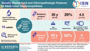 Nephronophthisis (NPH) has recently been considered a monogenic cause of end-stage kidney disease (ESKD) in adults. In this study, the authors looked at 18 sporadic adult patients suspected of having NPH by renal biopsy. They analyzed 69 genes that cause hereditary cystic kidney disease and compared clinicopathologic findings between patients with and without pathogenic mutations in NPH-causing genes.