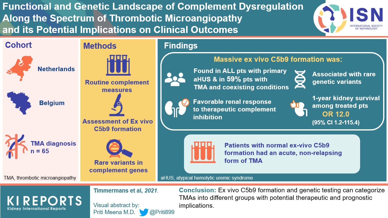 Ex vivo C5b9 formation was found in all patients with primary atypical hemolytic uremic syndrome and in 59% of patients with TMA and coexisting conditions. Ex vivo C5b9 formation was associated with rare genetic variants vs. patients with normal ex vivo C5b9 formation. They concluded that ex vivo C5b9 formation and genetic testing appear to categorize TMAs into different groups because they identify complement as a driving factor of disease, with potential therapeutic and prognostic implications.