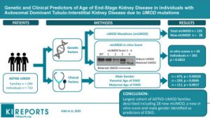 The genetic and clinical variables linked with the age of ESKD onset were investigated in this study. An in vitro score of mUMOD transit and the presence of gout, age of gout onset, and parental age of ESKD were all predictors of ESKD onset. The rs4293393 UMOD minor allele, which is linked to lower uromodulin production, was shown to be under-represented in ADTKD-UMOD families.