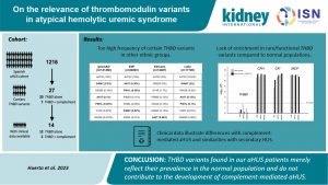 Overall, the conclusion was that patients carrying THBD variants do not exhibit the prototypical clinical profiles of patients with complement-mediated aHUS and resemble those with secondary HUS. This information is crucial for their therapeutic management and raises the issue that THBD variants found in aHUS patients may merely reflect their prevalence in the normal population.
