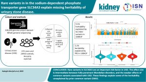 Although the etiology of urinary stone disease (USD) is multifactorial, genetics plays a significant role in its pathogenesis; it is estimated that the heritability of USD is around 45%. In this investigation, Sadeghi-Alavijeh et al. look for the presence of the SLC34A gene, which encodes the sodium-dependent phosphate transport protein 2C expressed in the proximal tubule (NaPi-IIc) in people with kidney stones, and found changes in 1 of 2 copies of the SLC34A3 gene (present in 5% cases compared with 1.6% of controls).