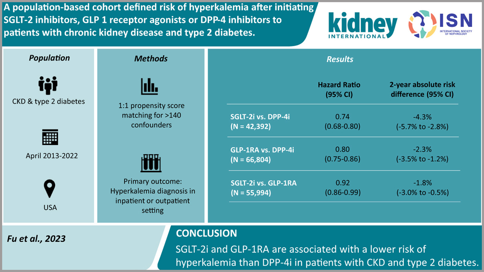 According to this study, individuals with type 2 diabetes and kidney disease who used SGLT-2i and GLP-1RAs were less likely to experience hyperkalemia than those who began using DPP-4i. The use of these drugs in patients with renal disease and type 2 diabetes is supported by this study.