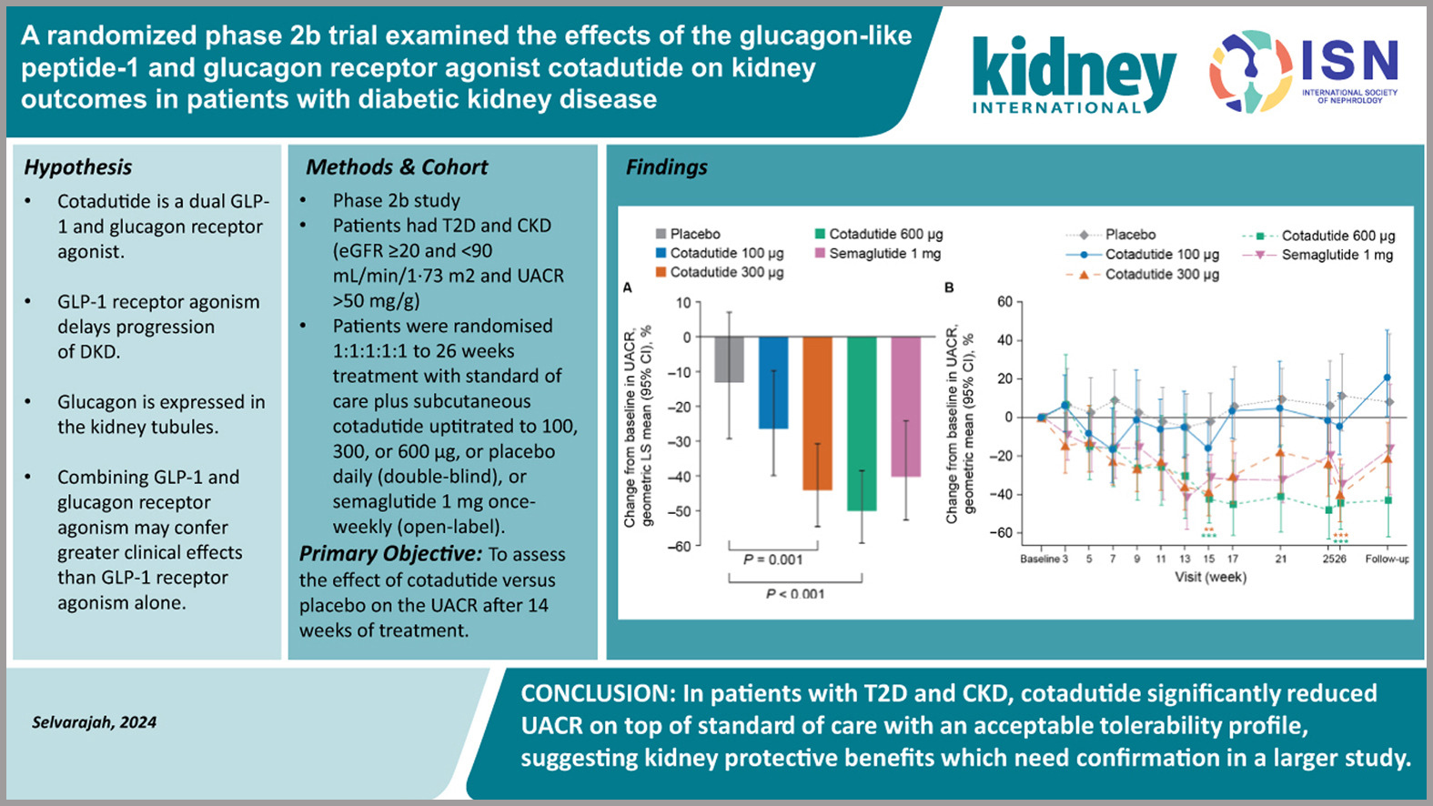 Diabetes mellitus is a leading contributor to the global burden of kidney disease, and recent advancements in diabetic kidney disease (DKD) management continue to generate significant interest. While GLP-1 receptor agonists have already demonstrated renal and metabolic benefits, cotadutide introduces an innovative approach by combining GLP-1 and glucagon receptor activation.