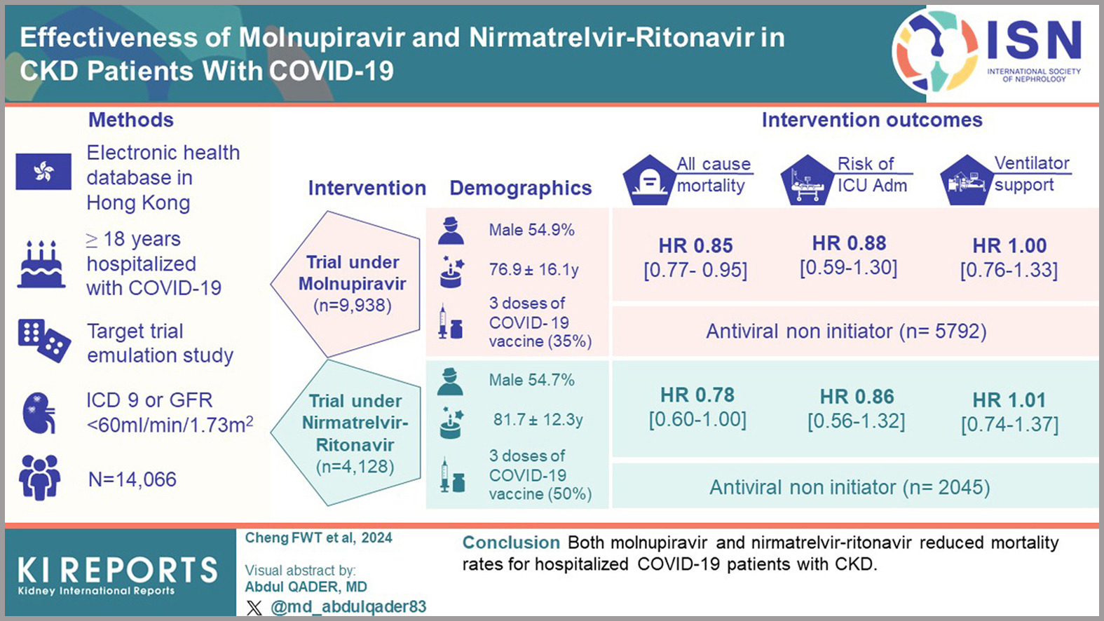This target trial emulation study assessed the effectiveness of nirmatrelvir-ritonavir and molnupiravir in reducing mortality and severe COVID-19 outcomes among patients with chronic kidney disease (CKD). Data were sourced from Hong Kong’s electronic health databases, focusing on adult CKD patients.