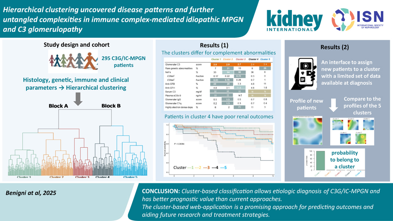 Five reproducible clusters emerged, each defined by distinct clinical features, degrees of complement activation, autoimmune abnormalities, and genetic variants. This cluster-based classification outperformed traditional histology in predicting kidney outcomes and post-transplant recurrence, underscoring its potential to guide risk stratification and therapeutic selection.