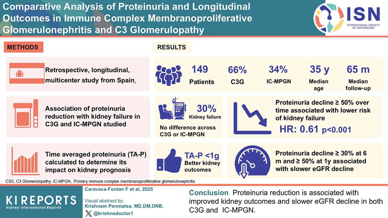 A ≥50% reduction in proteinuria was associated with slower estimated glomerular filtration rate decline and lower risk of kidney failure, whereas rising proteinuria independently predicted adverse outcomes, underscoring proteinuria as a dynamic prognostic biomarker.