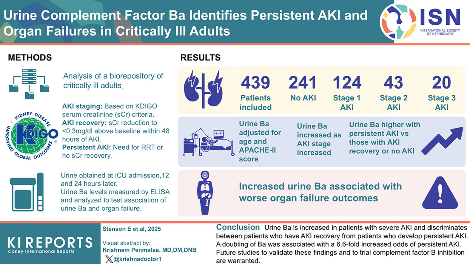 In a cohort of 439 critically ill adults stratified by KDIGO stage (no acute kidney injury [AKI], stage 1–3), higher urinary Ba–a marker of alternative pathway activation tracked with AKI severity–distinguished persistent AKI from recovery.
