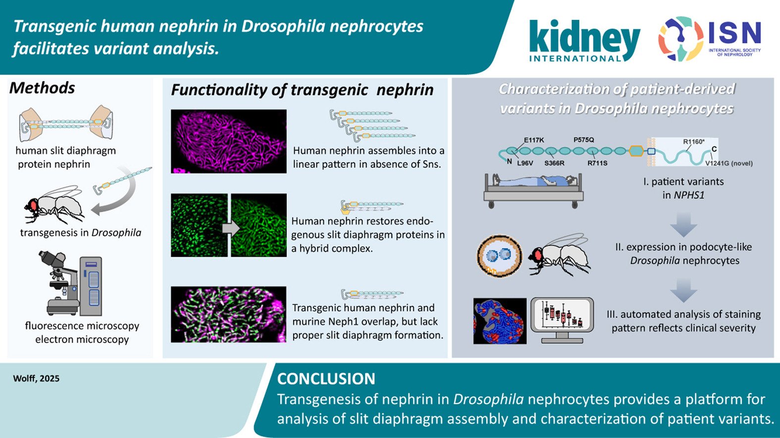 This study introduces Drosophila nephrocytes as a novel and viable model for analyzing human nephrin (NPHS1) variants implicated in congenital nephrotic syndrome. By expressing human nephrin in these cells after silencing Drosophila’s ortholog, researchers observed the formation of a hybrid linear architecture resembling mammalian slit diaphragms. This model allows for functional characterization of patient-derived NPHS1 variants, with altered protein patterns correlating with clinical severity — including a novel V1241G variant.