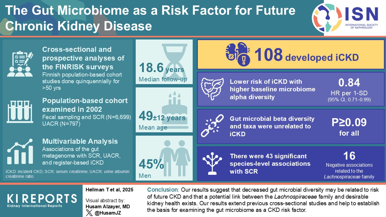 In this prospective study from the FINRISK 2002 cohort, researchers examined gut microbial profiles in 6,699 individuals and tracked incident CKD over a median of 18.6 years. They found that higher baseline gut microbiome alpha diversity was significantly associated with a lower risk of developing CKD (HR per 1 SD: 0.84; P = 0.04), while beta diversity and specific taxa were not linked to incident disease.