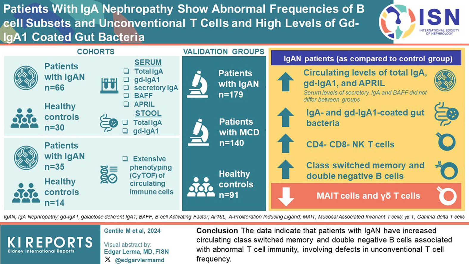 In this study, the authors measured serum total IgA, galactose-deficient IgA1 (gd-IgA1), secretory IgA (SIgA), B cell-activating factor (BAFF), and A proliferation-inducing ligand (APRIL) in patients with IgAN and healthy controls (HCs). They quantified the total IgA and gd-IgA1 in stool supernatant, along with the same molecules coated on bacteria. In a subset of patients and controls, they additionally performed extensive phenotyping of circulating immune cells, including unconventional T cells. These unconventional T cells are key players in mucosal immunity. They include mucosal-associated invariant T (MAIT) cells, γδ T cells, and natural killer (NK) T cells. The results were validated using RNAseq data from a larger cohort of patients with IgAN, patients with minimal change disease, and HCs.