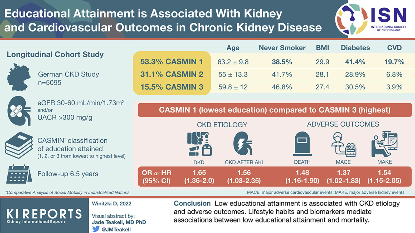 In addition to lifestyle measures, educational attainment had an inverse relationship with MACE, kidney failure and mortality risks. Patients with a lower educational level had increased adverse outcomes. Such studies reveal the social disparities affecting health outcomes and recognize sectors that require change or reinforcement when making health policies.