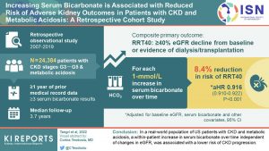 Metabolic acidosis is a common complication of advanced CKD, and lower serum bicarbonate levels are related to an increased risk of CKD progression. This association has been demonstrated in previous studies, but most of them only consider the measurement of serum bicarbonate at a single point in time. What about serum bicarbonate changes over time? Could they be related to adverse kidney outcomes? To answer these questions, Tangri et al. performed a retrospective analysis of a cohort of patients with CKD stages G3 to G5 and metabolic acidosis, and they found that the increase in serum bicarbonate over time was associated with a low risk of the composite kidney outcome (≥ 40% decline in eGFR or evidence of dialysis or transplantation) with an 8.4% risk reduction per 1mmol/l increase in serum bicarbonate over time.