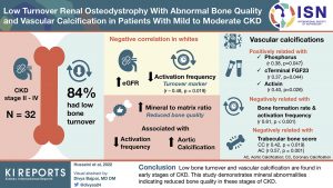 This paper by El-Husseini et al. evaluates the presence of both conditions in patients with early CKD. The authors use a combination of imaging, tissue diagnosis, and biomarkers to establish diagnoses. Mean estimated glomerular filtration rate was 44 in the group studied, 84% had low bone turnover, and >80% had VC.