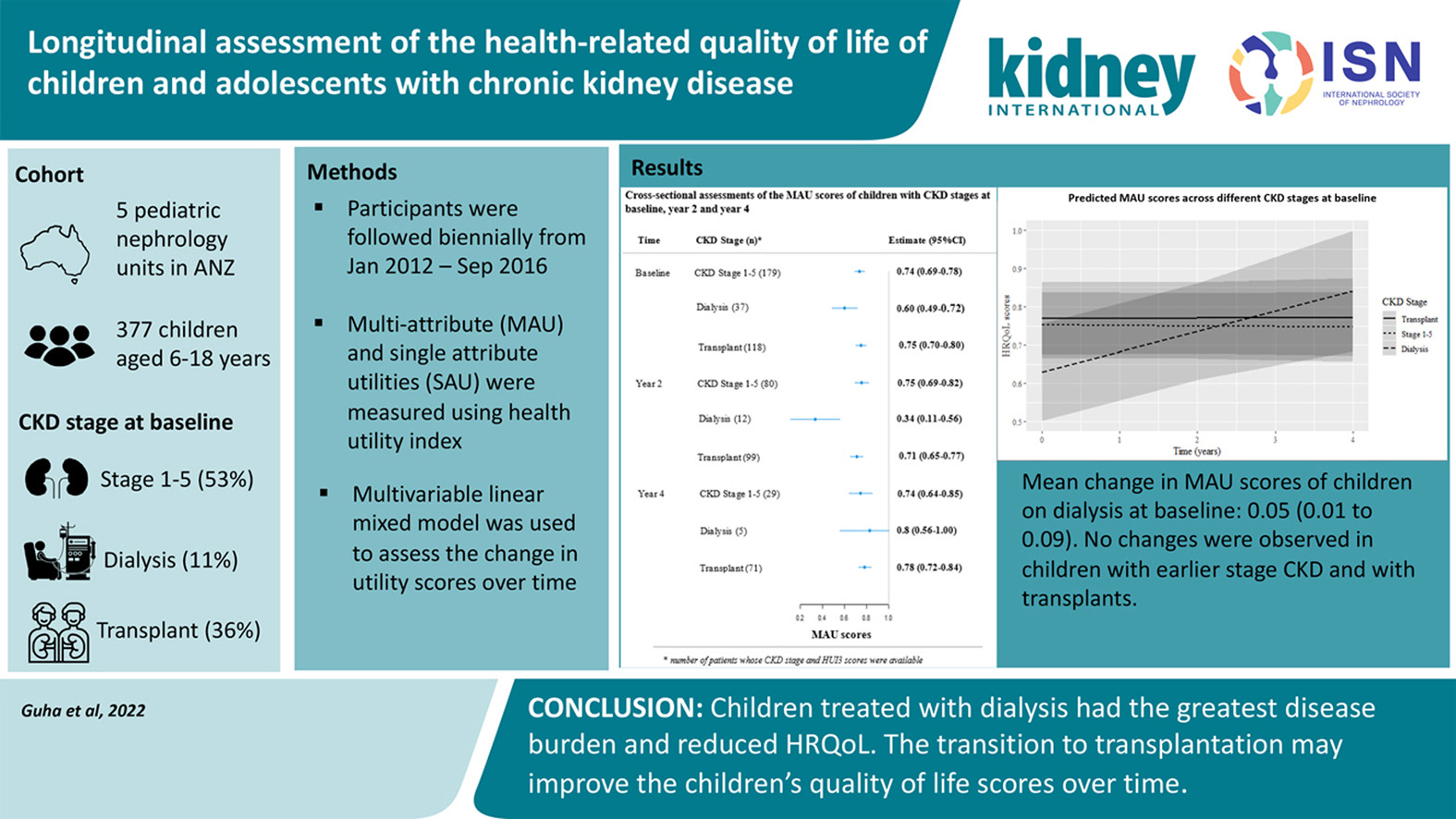 This work from Australia by Guha et al. follows the trajectories of HRQoL in children with CKD over time. A total of 377 children (aged 6-18 years) with CKD stages 1-5 (pre[1]dialysis), dialysis, or transplant were followed biennially for four years. Multi Attribute Utility (MAU) scores of HRQoL were measured at baseline and at two and four years using the McMaster Health Utilities Index Mark 3 tool. A multivariable linear mixed model was used to assess the trajectories over time in 199 children with CKD stage 1-5: 43 of whom were receiving dialysis and 135 of whom were kidney transplant recipients.