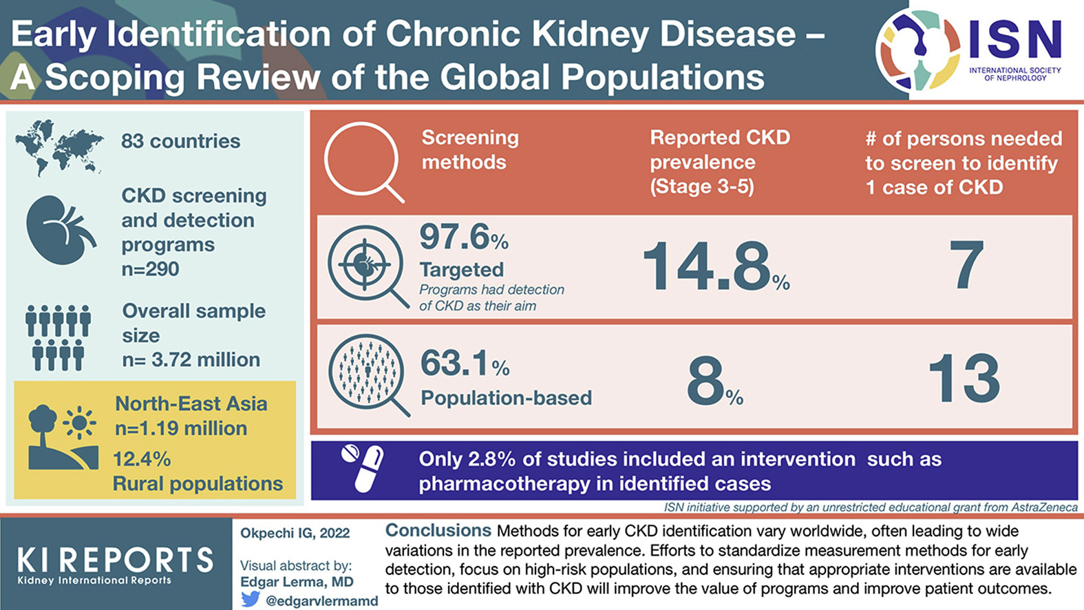 Except for CKD, the burden of noncommunicable diseases such as ischemic heart disease, stroke, and obstructive pulmonary disease has decreased during the last decade. Early detection of CKD necessitates the development of distinct techniques tailored to various cultures, regulations, and environmental factors. Screening procedures and preventive interventions are still hotly discussed topics. Ikechi G. Okpechi, Adeera Levin, Vivekanand Jha, and colleagues discuss
