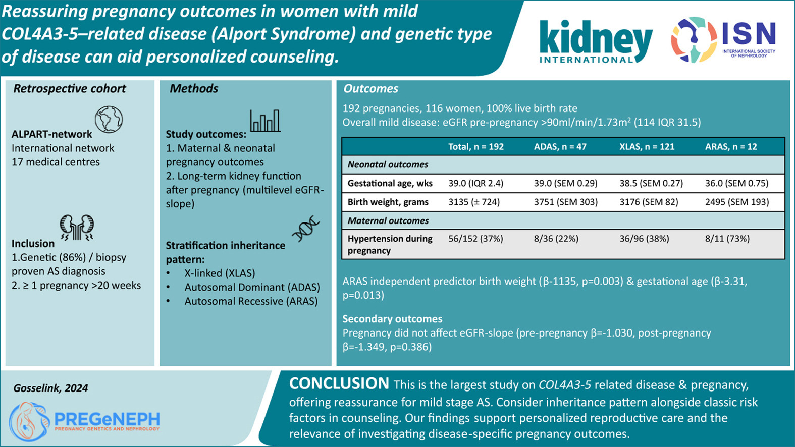 Pregnancy in women with chronic kidney disease (CKD) presents unique challenges, necessitating specialized care and monitoring. CKD can adversely affect pregnancy outcomes, increasing the risk of gestational hypertension, preeclampsia, preterm birth, and low birth weight. For women with Alport Syndrome (AS), these risks vary with the disease’s inheritance patterns: X-linked, autosomal dominant, or autosomal recessive.