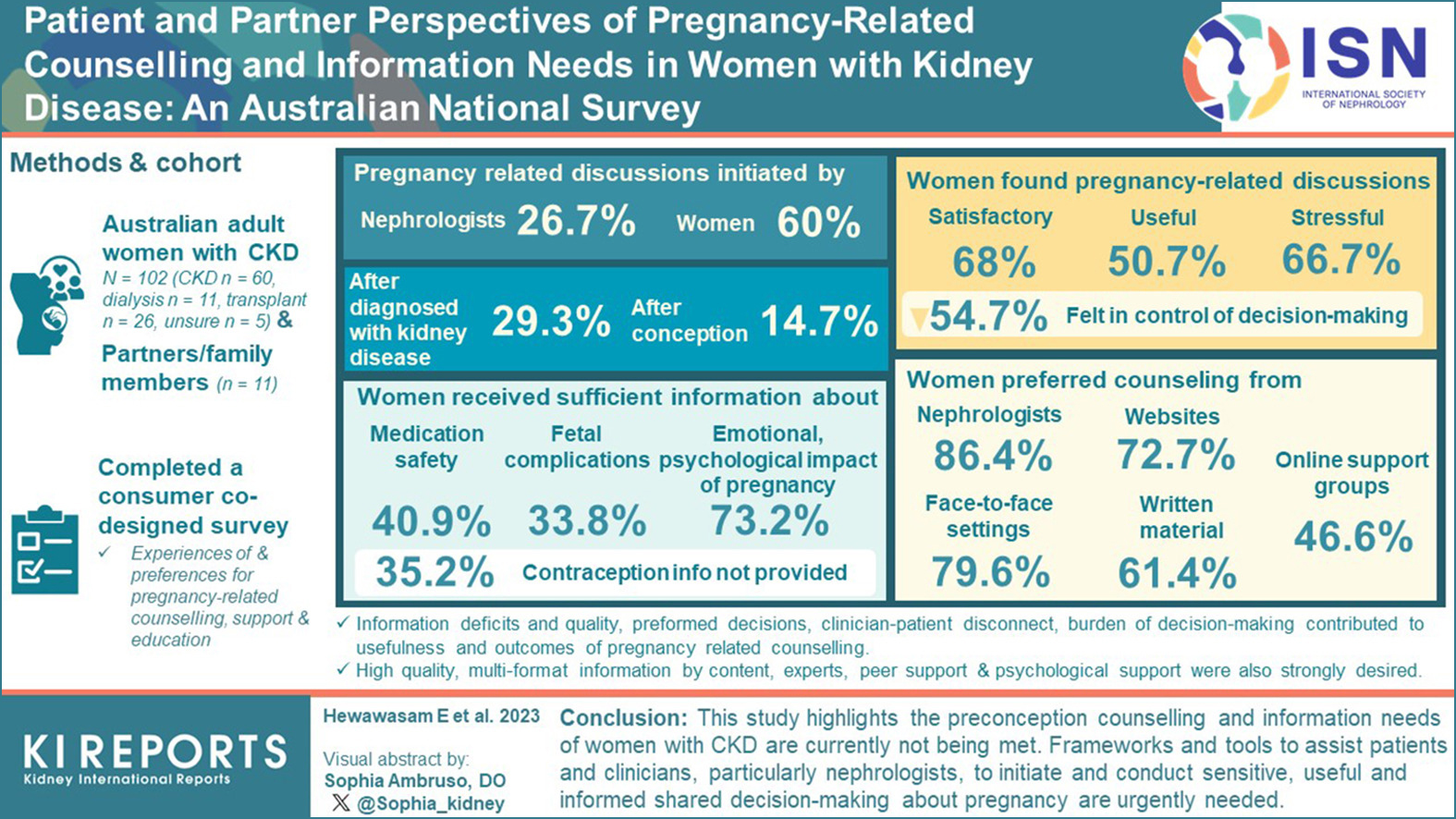 The experiences and information needed for reproductive health counseling among women with chronic kidney disease (CKD) are poorly defined despite the established importance of pregnancy planning in this higher-risk demographic. Australian adult women with CKD, as well as their partners or family members, participated in a consumer-designed survey to discuss their experiences and preferences for pregnancy-related counseling, support, and education.