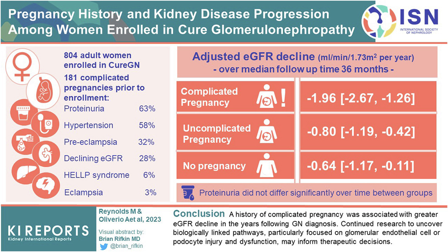 In this study by Reynolds and colleagues, changes in estimated glomerular filtration rate (eGFR) were evaluated in women included in the Cure Glomerulonephropathy study.