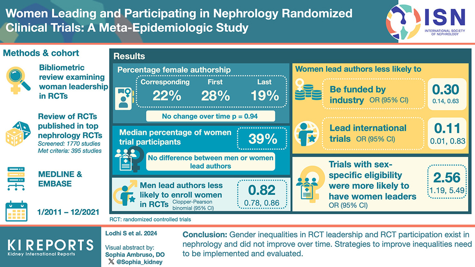 The share of women in corresponding, first, and last authorship positions remained consistent at 20% across time (P ¼ 0.94). Male lead authors were statistically less likely to enroll women in RCTs. Female lead authors were less likely to be sponsored by industry (OR: 0.30; 95% CI: 0.14-0.63; P ¼ 0.002) or to lead international trials (OR: 0.11; 95% CI: 0.01-0.83; P ¼ 0.03). Trials with sex-specific eligibility criteria had a higher likelihood of having female leaders (OR: 2.56; 95% CI: 1.19-5.49; P ¼ 0.02) than those without. Gender discrepancies in RCT participation and leadership persist in nephrology and have not improved over time. Strategies to address inequities must be implemented and assessed.