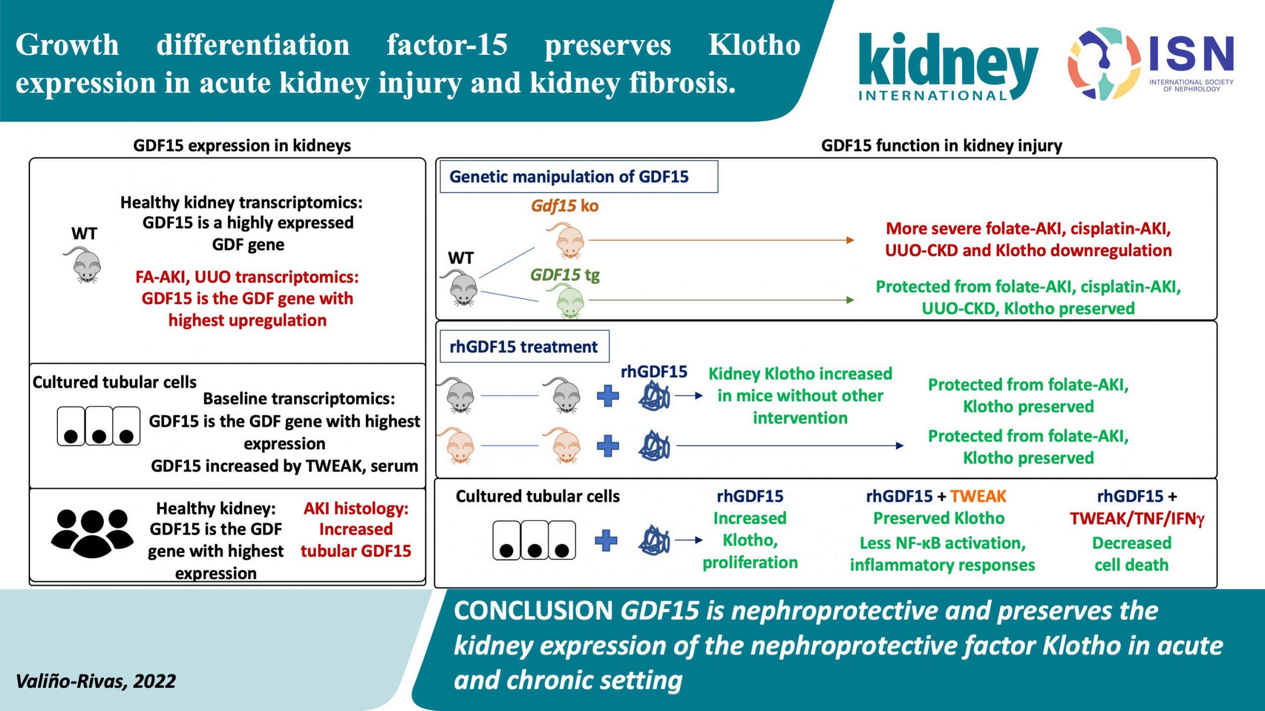 In this study, Valiño Rivas et al. explored the function of GDF15 in experimental AKI and kidney fibrosis and its relationship to the modulation of the expression of Klotho. They demonstrated a nephroprotective role of GDF15; in induced AKI, increased levels of GDF15 were found. In the absence of GDF15, the severity of AKI was higher, and the expression of Klotho was depressed. Exogenous administration of GDF15 provides kidney protection and preserves Klotho expression.