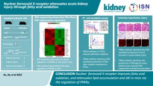 Inhibition of fatty oxidation (FAO) leads to lipotoxicity and energy deprivation in renal proximal tubular cells during acute kidney injury (AKI). Farnesoid X receptor (FXR) is a transcription factor that regulates the expression of genes involved in FAO and peroxisome proliferator-activator receptor -g signaling. Activation of FXR has been shown to protect against AKI, but the mechanisms were unknown. The authors of this study, Xu et al., tested the hypothesis that increased FXR is protective in cisplatin-induced AKI (CP-AKI) through FAO and PPAR-g expression. This study provides insight into the mechanisms of AKI and suggests some potential strategies for therapeutic intervention.
