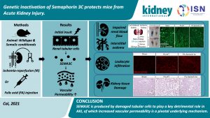 SEMA3C is present in embryonic kidneys and disappears in adulthood. Its upregulation is specifically noted in diseased kidneys in both mice and humans, where kidney biopsies have evidence of tubular immunostaining for SEMA3C. Destructive mechanisms of acute kidney injury (AKI) are induced by SEMA3C causing vessel hyperpermeability, leading to impaired blood flow, interstitial edema, and inflammatory cell infiltration into renal tissue. Furthermore, rises in urinary SEMA3C levels were noted even before elevation in urea levels. Significant improvement in microvascular blood flow, along with a reduction in inflammatory cell infiltration into renal tissue, was seen in the group with downregulation of SEMA3C compared to the control group. Also, SEMA3C’s interaction with plexin-D inhibits lymphangiogenesis and its downregulation could alleviate renal damage by increasing lymphangiogenesis.