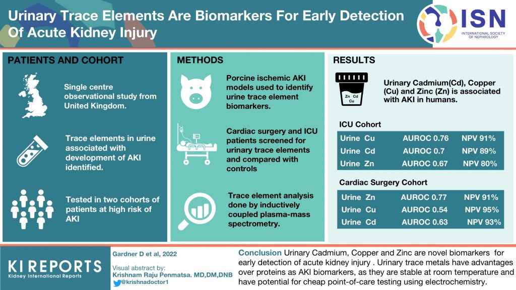 Using a porcine model of ischemia-induced AKI they detected urinary cadmium (Cd), copper (Cu), and iron (Fe) as potential biomarkers. These were then tested in two observational cohorts of patients at risk of developing AKI, namely those undergoing cardiac surgery (n=151) and ICU admissions (n=150).