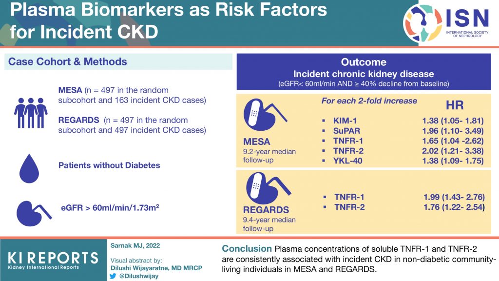 In this study, Sarnak and Colleagues in the US evaluated an association of novel plasma biomarkers with incident CKD using a case-cohort design in patients without diabetes with a baseline GFR of 60 or above. Incident CKD is defined as development of eGFR < 60 or a 40% decline from baseline. Six plasma biomarkers were evaluated, and Cox regression models used to estimate hazard ratios of incident CKD. The paper concludes that plasma concentrations of biomarkers TNFR-1 and TNFR-2 are consistently associated with incident CKD in non-diabetic patients. It is likely that if these biomarkers are adapted for early use and become accessible for everyday use, we may be able to slow down the deluge of CKD in the future.