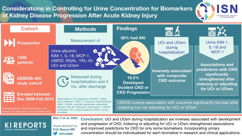 In this cohort study, Wen et al. assessed the associations and predictions of urine biomarkers with incident chronic kidney disease (CKD) and CKD progression. They report that UCr and urine osmolality (UOsm) during hospitalization were inversely associated with the development of CKD. Also, they found that some biomarkers, such as KIM-1, IL-18 and MCP-1, are associated with CKD after the indexation for UCr or UOsm.