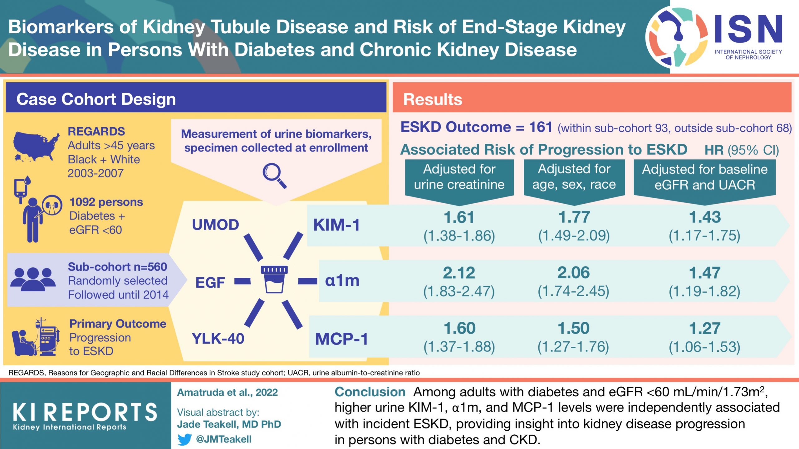 Serum Creatinine and uACR are currently gold standards of kidney function assessment, but we rely heavily on biopsy to detect tubular insufficiency. Biomarker detection is emerging as an important indicator of tubular injury and dysfunction at a cellular level. In this study, every two-fold rise in urine KIM-1, α1m, and MCP-1, independent of eGFR and uACR, was associated with ESKD, supporting the hypothesis that tubular damage is an important pathway of CKD progression in diabetes.