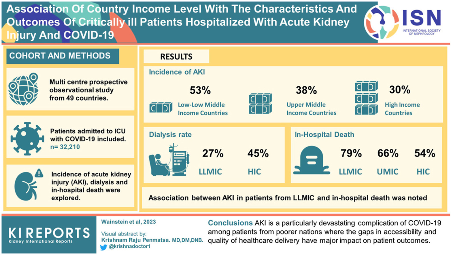 AKI incidence was highest in patients in LLMIC, followed by UMIC and HIC, whereas dialysis rates were lowest among patients with AKI from LLMIC and highest among those from HIC. Patients with AKI in LLMIC had the most significant proportion of community-acquired AKI and the highest rate of in-hospital death. The association between AKI, being from an LLMIC, and in-hospital death persisted even after adjusting for disease severity. The results suggest poorer nations have more COVID-19-related AKI and worse outcomes.