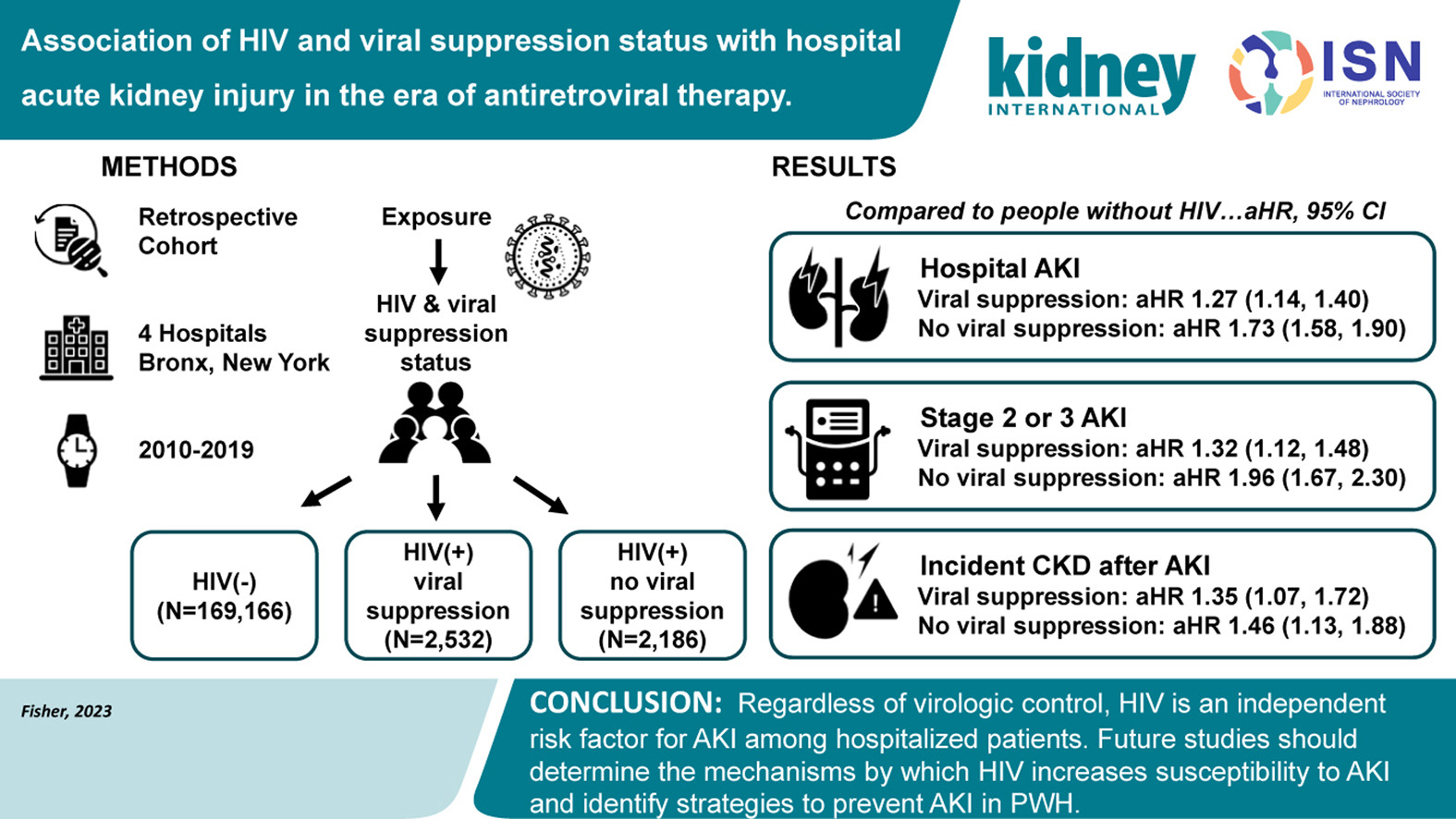 The study included 172,884 hospitalized patients, of whom 4718 had HIV and 2532 were virally suppressed. The incidence of hospital AKI, stage 2 or 3 AKI, and incident CKD were higher among those with HIV than without. Among those with HIV and no viral suppression, the outcomes were less favorable than among those with viral suppression. The study highlights that regardless of virologic control, HIV is an independent risk factor for AKI among hospitalized patients.