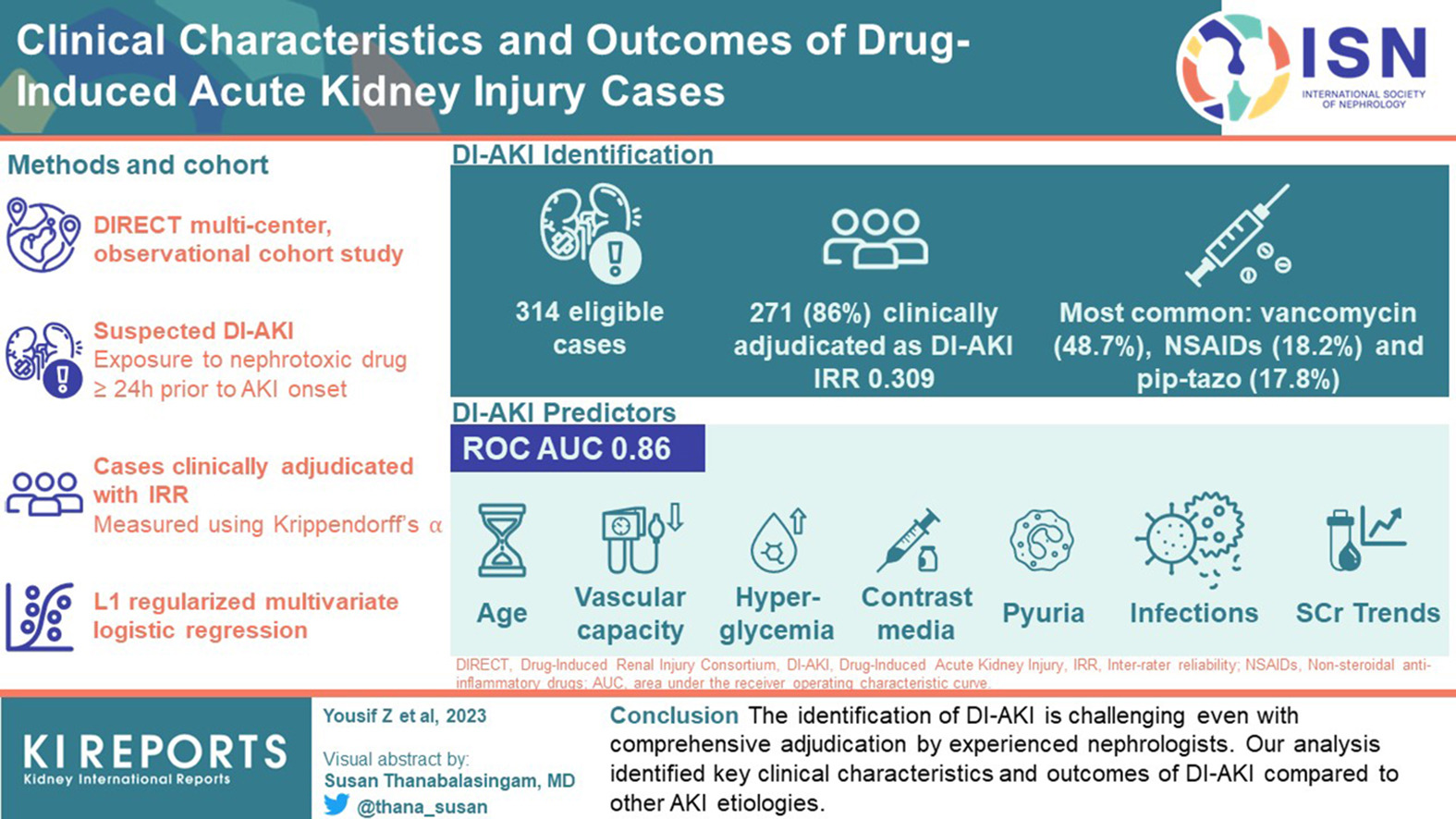 A multivariate logistic regression model was built, and its performance was evaluated using the area under the receiver operating characteristic curve (ROC AUC). The multivariable model found age, vascular capacity, hyperglycemia, infections, pyuria, serum creatinine (SCr) trends, and contrast media as important predictors of DI-AKI with high performance (ROC AUC 0.86). DI-AKI is difficult to identify. This study’s research highlighted critical clinical characteristics and outcomes of DI-AKI compared to other AKI etiologies.