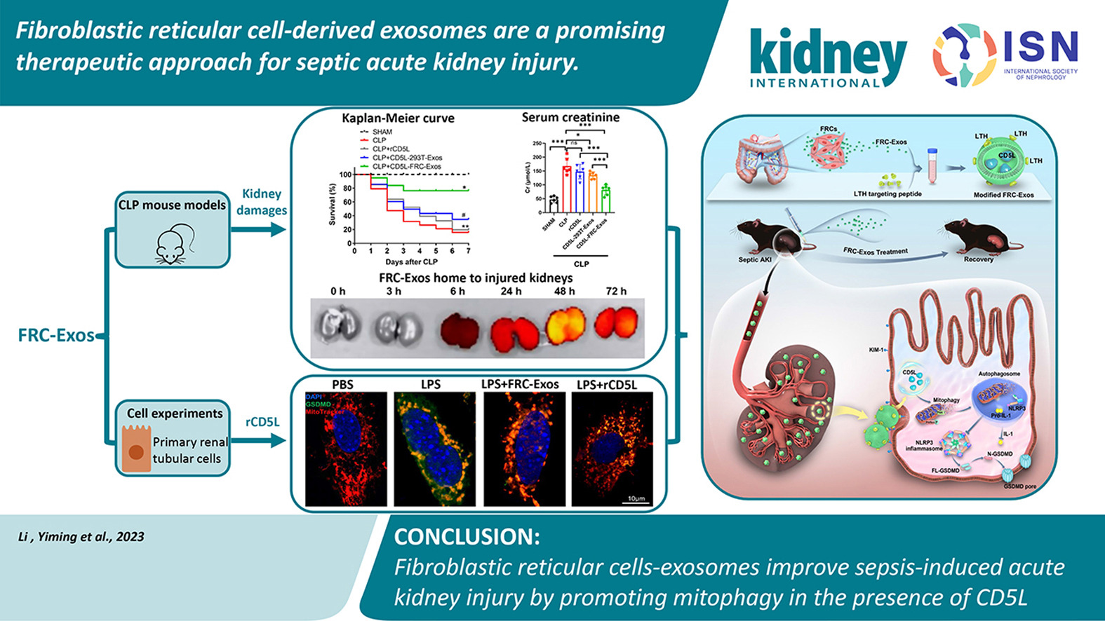 The study explores a novel treatment for S-AKI, a condition with high mortality and limited treatment options. It focuses on the therapeutic potential of fibroblastic reticular cell-derived exosomes (FRC-Exos). The research demonstrates that FRC-Exos, especially when modified to contain higher levels of the protein CD5L, effectively target and improve kidney function in a mouse model of sepsis. This improvement is achieved by mechanisms such as promoting mitophagy and inhibiting inflammasome activation in kidney cells.