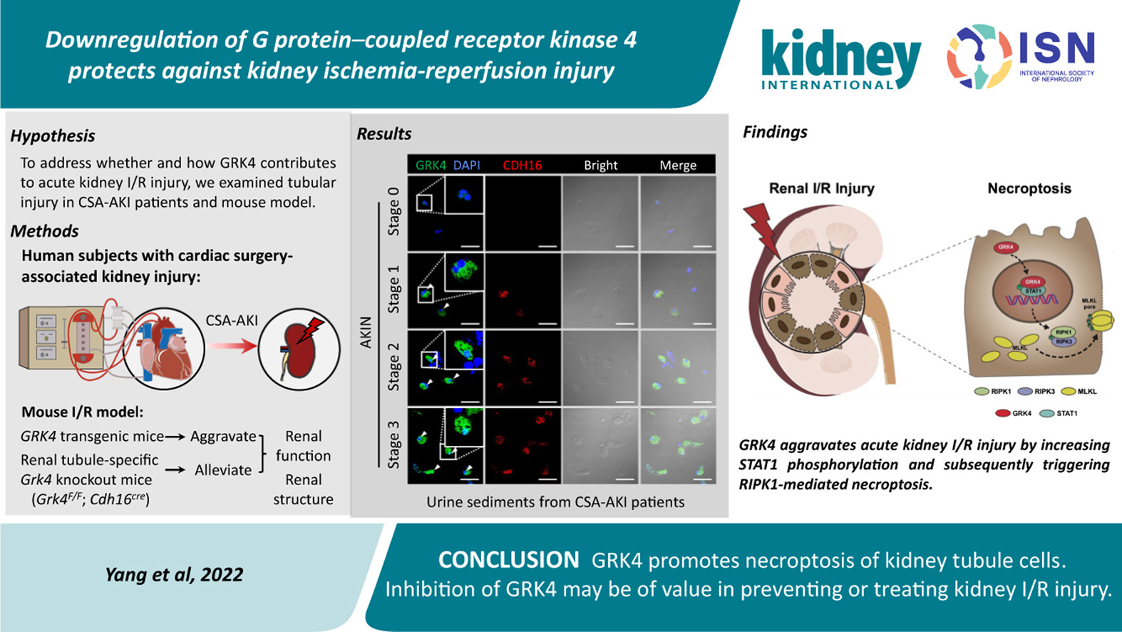 One important mechanism in renal ischemia/reperfusion (I/R)-induced acute tubular necrosis is necroptosis. The current investigation determined the function of G protein-coupled receptor kinase 4 (GRK4) in tubule cell necroptosis. Protective effects were achieved by GRK4 deficiency or downregulation using drug delivery based on nanoparticles. These results imply that GRK4 is a potential therapeutic target and regulates the degree of kidney I/R injury.