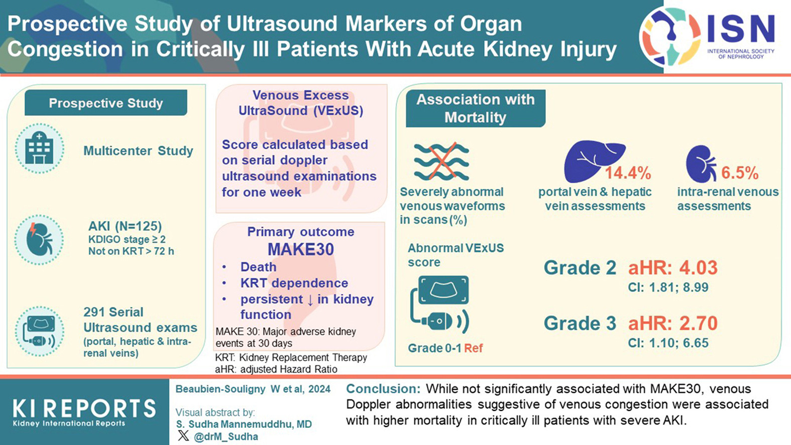 This prospective, multi-center study of patients with severe AKI investigated the utility of Doppler ultrasound to identify adverse outcomes. Venous Doppler abnormalies were not significantly associated with MAKE30 but demonstrated evidence of increased mortality. Critical patients with cardiovascular involvement were found to have significant venous Doppler markers and congestive changes compared to counterparts with sepsis and other medical diagnoses. The VExUS score was also associated with mortaility, suggesting its promise as a measurement tool.
