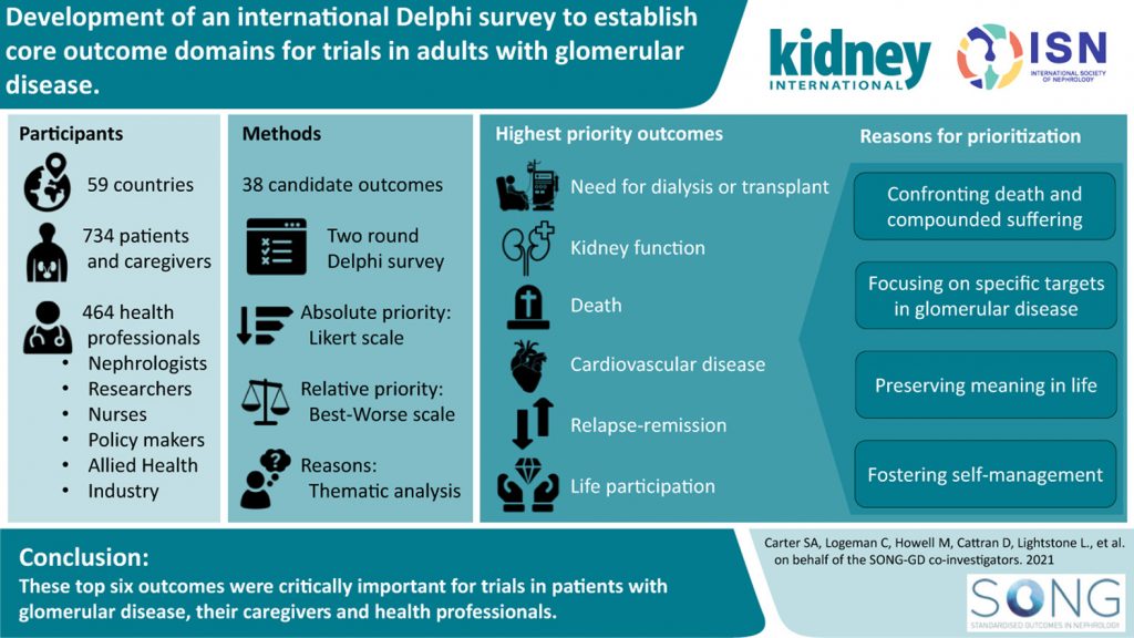 This survey, published as a companion paper to the KDIGO clinical practice guideline for the management of glomerular diseases, and Executive Summary, sought to establish a consensus-derived set of critically important outcomes in future trials. Four priorities were defined: confronting death and compounded suffering, focusing on specific targets in glomerular disease, preserving meaning in life, and fostering self-management.