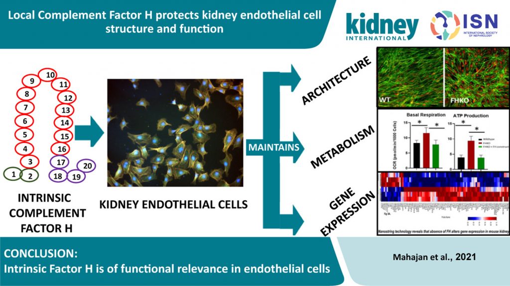 Circulating complement factor H (FH) is a key regulator of the alternative complement pathway. The authors interrogated the role of FH locally produced by endothelial cells. Using cultured kidney FH-deficient murine and human endothelial cells, they found that in the absence of FH, the cells’ cytoskeleton was remodeled, cellular energy metabolism was altered, and proliferation increased. These changes could be reversed by FH repletion. Additionally, in the absence of FH, murine kidney endothelial cells initiated a pro-inflammatory gene program. These data suggest that endothelial FH is important in maintaining endothelial integrity.
