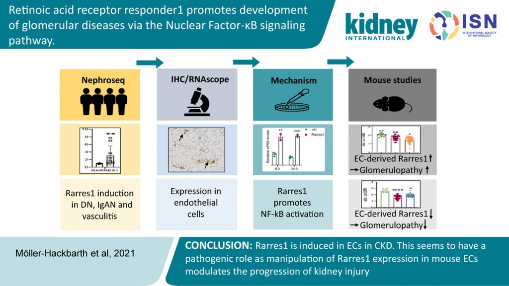 This study is another example of the role of endothelial cells in glomerular diseases. The investigators found that in diabetic kidney disease, ANCA-vasculitis, and IgA nephropathy, retinoic acid receptor responder 1 (Rarres1) was preferentially localized in glomerular and peri-tubular endothelial cells. To examine the role of endothelial Rarres1, the protein was either overexpressed or knocked out in renal endothelial cells. Mice overexpressing endothelial Rarres1 and given nephrotoxic serum had more severe podocyte damage than control mice, and conversely, podocytes were better preserved after induction of nephrotoxic nephritis in Rarres1 knockout mice. These data suggest Rarres1 in the glomerular microvasculature may be a mediator of podocyte injury and open up new therapeutic approaches.