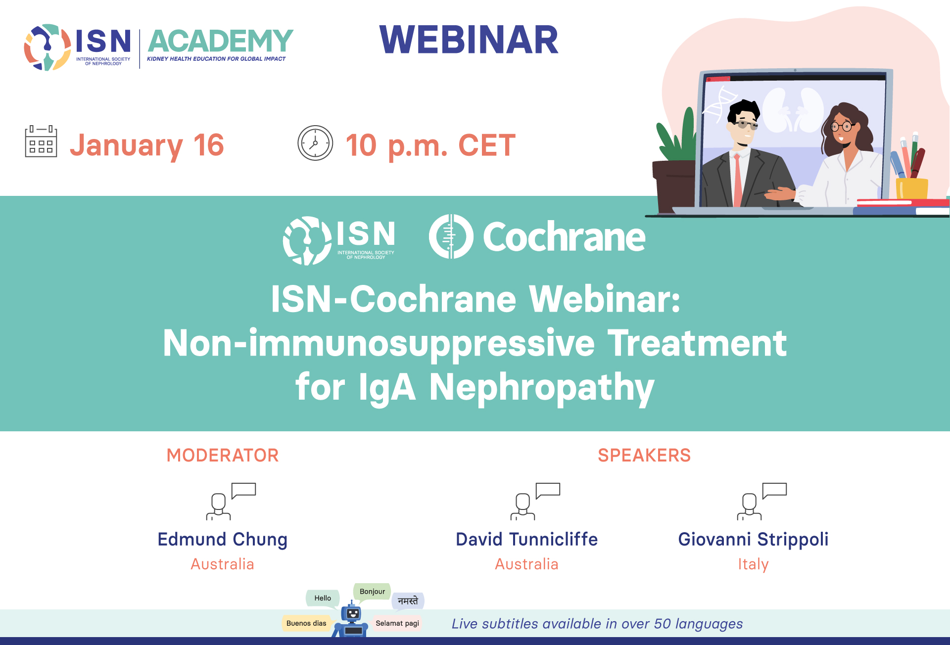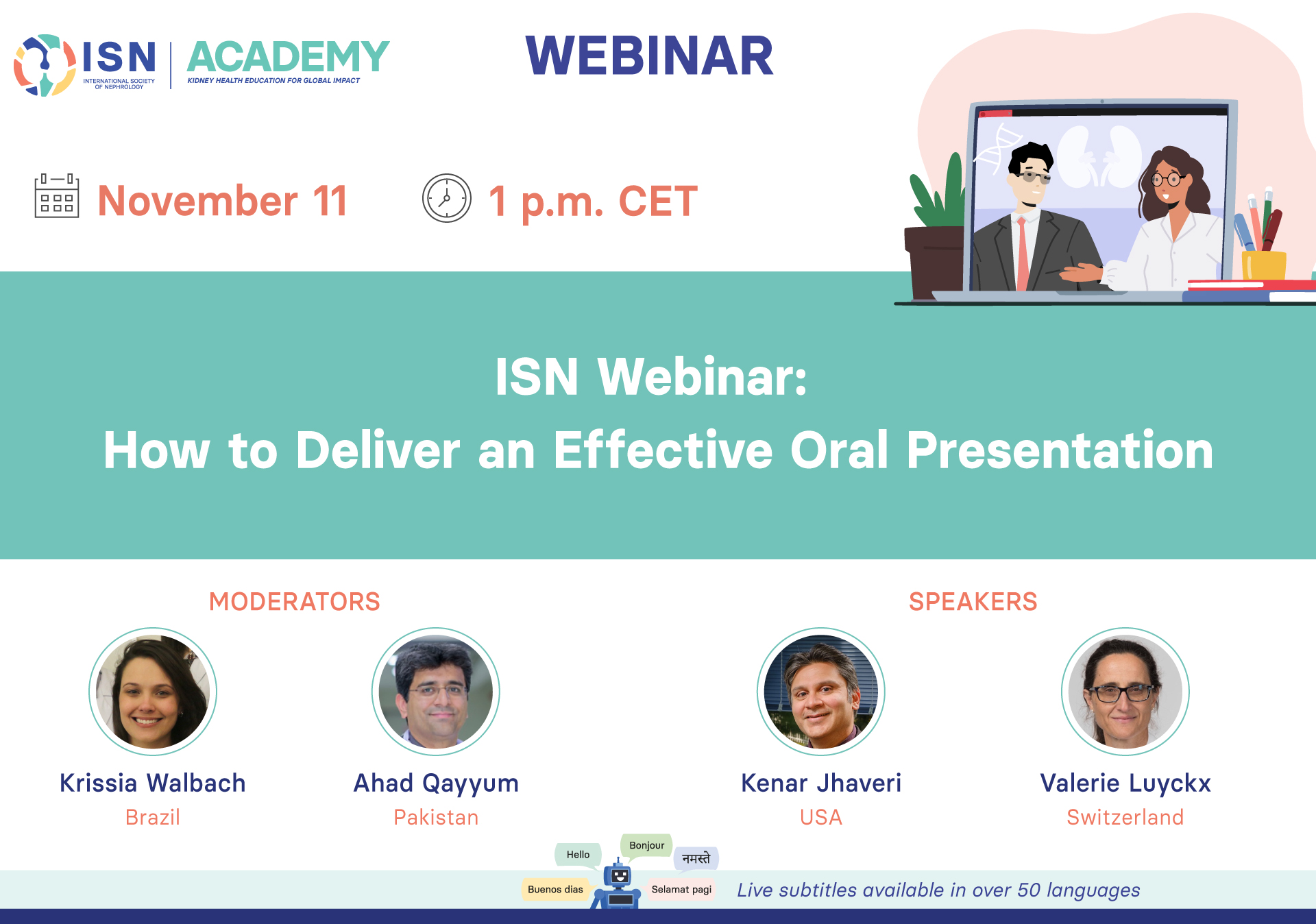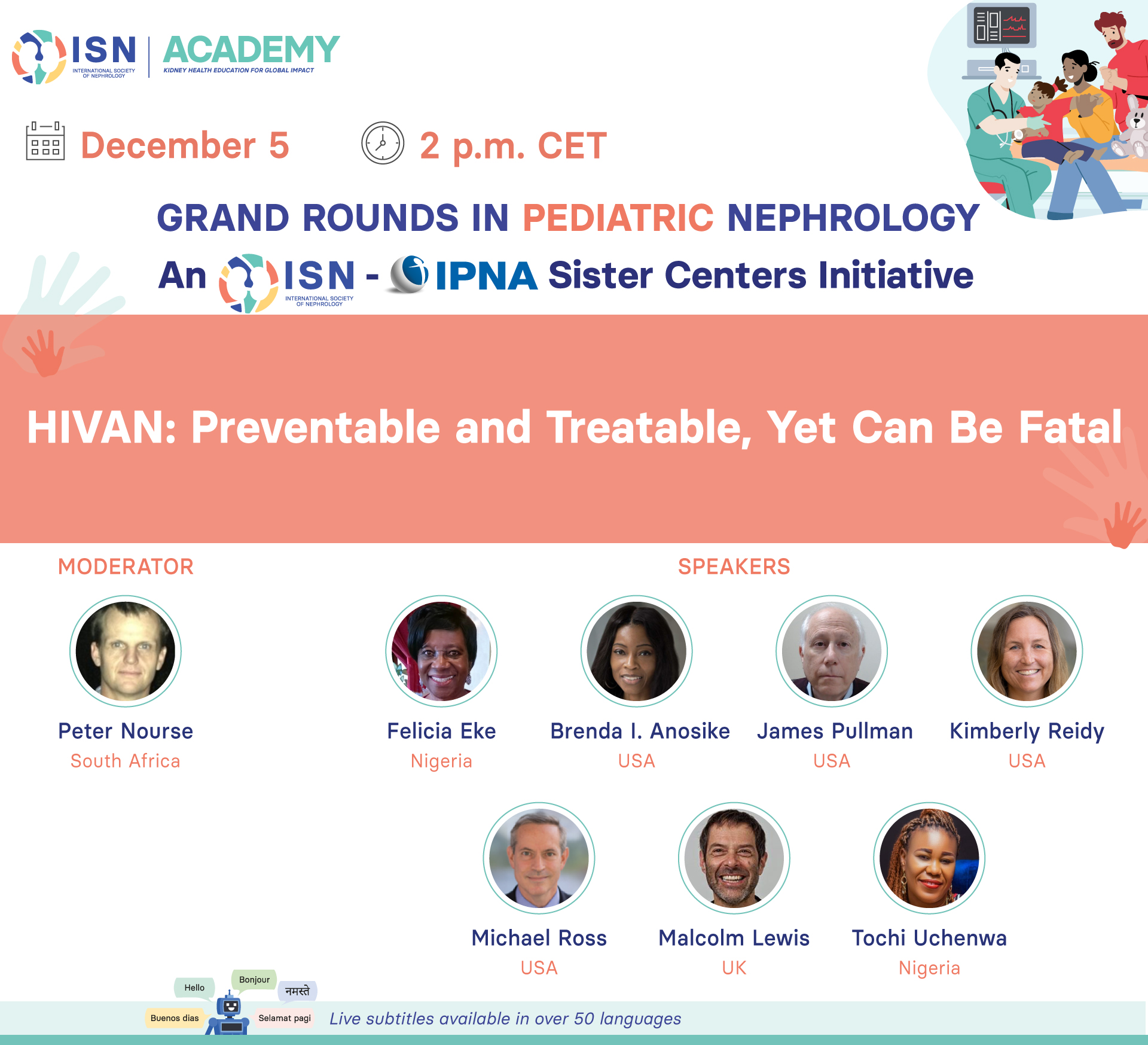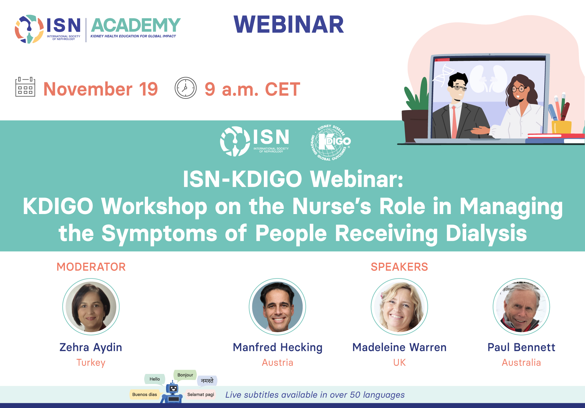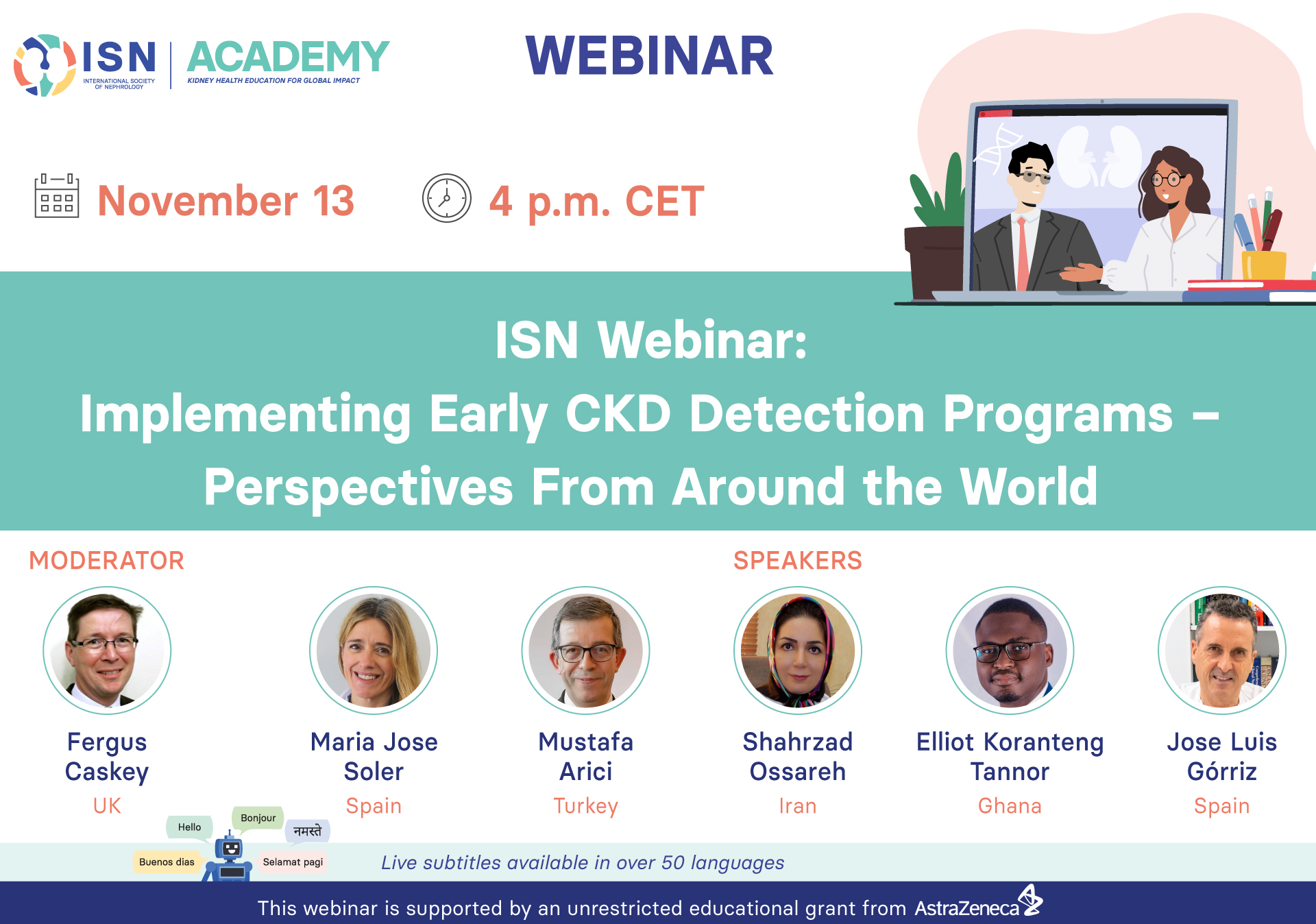 The ISN provides regular live and recorded webinars in several languages covering a range of topics relevant to the nephrology community.
